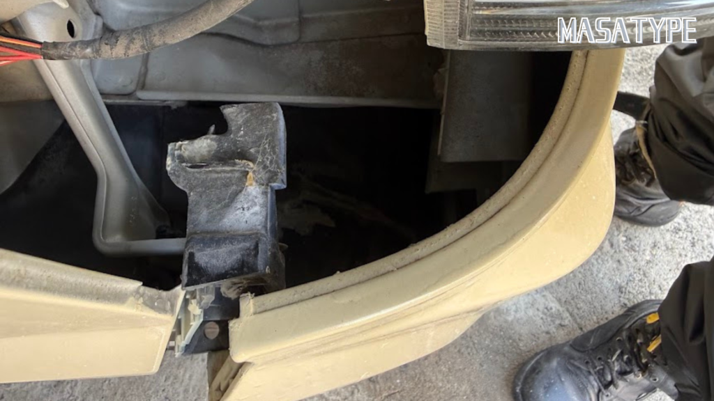 - バンパーをめくる バンパーの端を手前に強めに引っ張ります。爪が割れている車両なら、抵抗なく「ガバッ」と開くはずです。これで交換部分にアクセスできます。